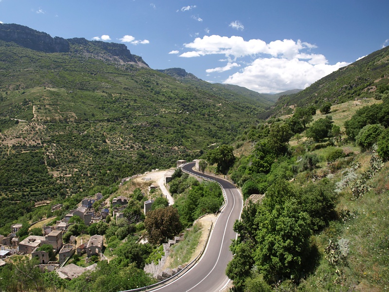 Za sedlem bylo městečko Gairo, kde jsem doufal, že bych mohl koupit plášť na horské kolo. Byla právě siesta a všechno bylo zavřené. Místní kontaktovali majitele obchodu s průmyslovým zbožím, jenže nakonec jsme nechtěli tak dlouho čekat. Vzdálenost do cíle dne před námi byla ještě dlouhá. Problém jsem označil za vážný, nikoliv však kritický. Prohození plášťů zřejmě nejhorší vyřešilo. Silnice dále procházela Gairo Vecchio, které je městem duchů. Staré Gairo bylo zničeno sesuvem půdy, a tak se lidé přestěhovali do nového města. Opět jsme minuli nádraží sardinské úzkorozchodky. Železnice musí v horách pěkně kličkovat, aby dosáhla potřebnou výšku. Silnice vede sice poněkud nahoru a dolů, ale jinak nám celkem pěkně ubíhala. Na severu se opakovaně objevoval výhled na horu Perda Liana s jejím neobvyklým tvarem, jak z amerického Monument Valley. Vidět byl i hřeben s nevýraznou avšak nejvyšší horou Sardinie Punta la Marmora, která má 1 894 metrů nad mořem. Projížděli jsme vesničkami s exotickými názvy Taquisara nebo Ussassai. Bylo v nich jak po vymření. Byli jsme v pohoří Barbagia, které ke svému názvu přišlo údajně již za dob Římanů, kteří takto označili kraj, v němž žili z jejich pohledu barbaři. Obyvatelé Sardinie se vždy stahovali do vnitrozemí, kde hledali ochranu před nájezdy zvenčí.
