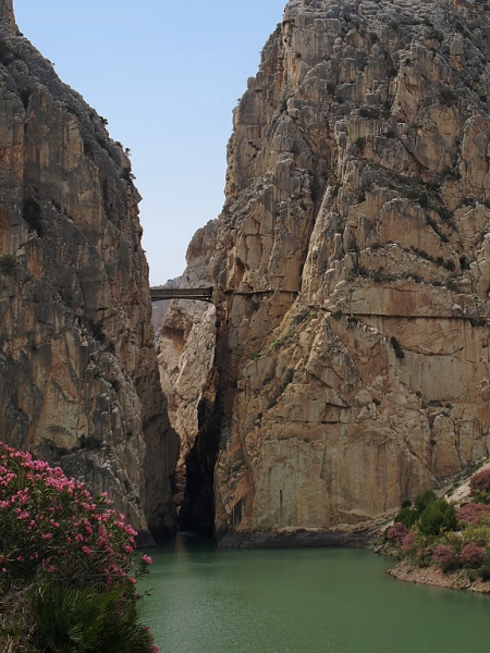 Za městem jsme narazili na zajímavé vodní dílo, zavlažovací kanál, který je veden na mostech a tunely. Sledovali jsme tok řeky Guadalhorce proti proudu až do míst, kde se hory kolem údolí semknou a kde byla vystavěna přehrada. Zde je malá vesnice El Chorro. Dá se odtud dojít k závěru jen deset metrů široké rokle Garganta del Chorro. Okolní kolmé skály padají kolmo dolů do vody dnešní přehrady, která dojem z tohoto místa údajně poškodila. Na jejich stěnách byla pracovníky vodních elektráren na začátku minulého století zbudována vysutá stezka pro obsluhu. Po dokončeném chodníku se později prošel sám španělský král Alfonso XIII a od té doby se stezce říká Stezka králů (Caminito del Rey). Stezka vede přes sto metrů vysoko nad vodní hladinou a časem byla značně poškozena. Přestože na ní je jištění fixními lany, je už dnes velice adrenalinovou stezkou odvahy. Nástup stezky byl proto stržen a nedá se na ni dostat. Někde jsme se dočetli, že již v roce 2011 měla začít nákladná rekonstrukce, ale žádné stopy po opravě jsme neviděli. Skály jsou ale stále oblíbeným místem horolezců, a tak jsme se pokusili v blízkém kempu sehnat kartuši do vařiče, protože jsme předpokládali, že by ji tu mohli mít. Bohužel bez úspěchu.